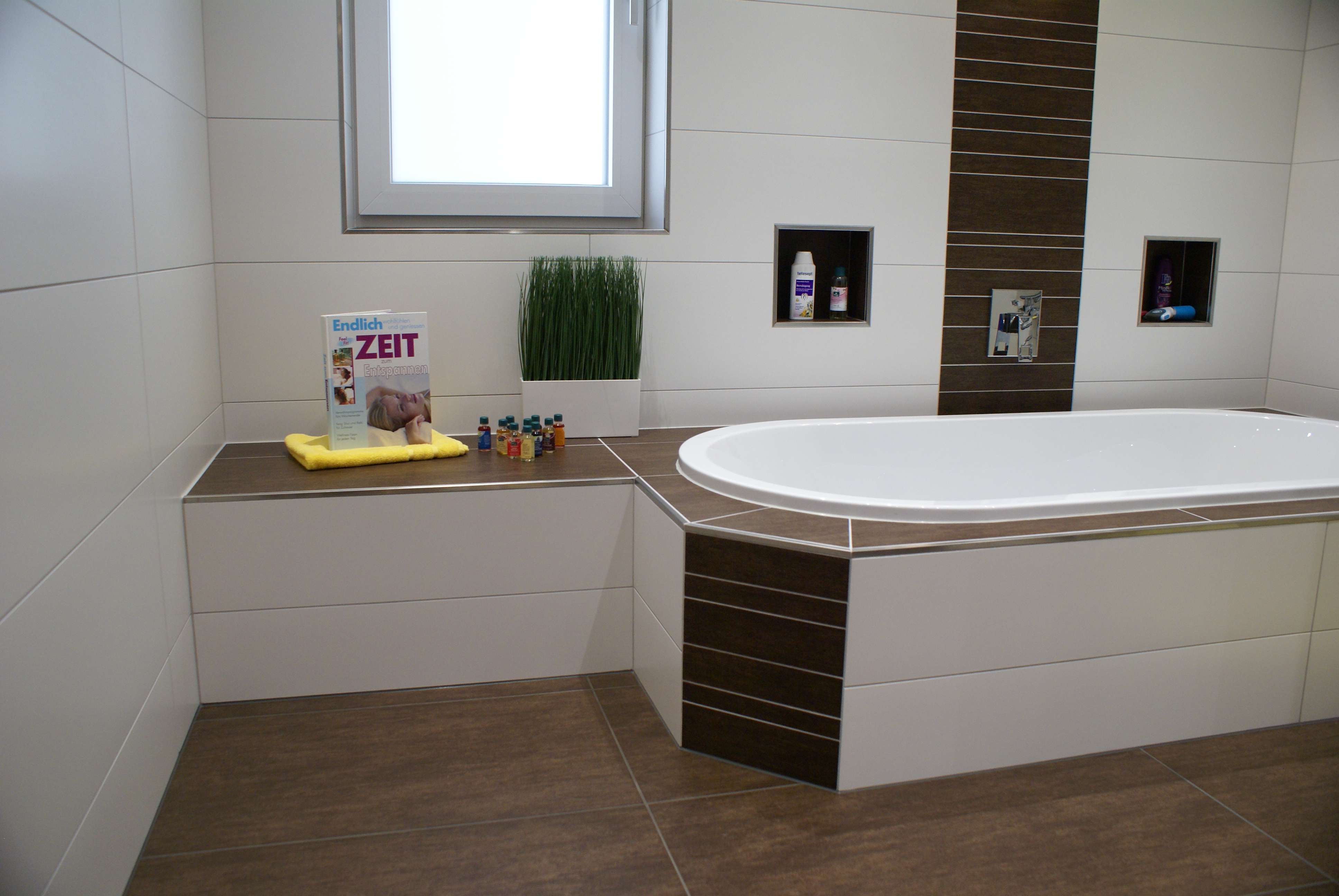 Klassische weiße Eleganz trifft in diesem Bad auf warme Brauntöne und erzeugt so eine einladend wohnliche Stimmung. Geschnittene Bodenfliesen, die zur Wandgestaltung verwendet wurden, setzen Akzente als Eyecatcher. Großzügige Ablageflächen und geflieste Nischen bieten sich wunderbar als Stellflächen für dekorative Accessoires und Pflegeprodukte an. Fliesen Gerald schuf in enger Abstimmung mit dem Kunden genau das harmonische Bad mit viel Raum zum Wohlfühlen, das gewünscht war.